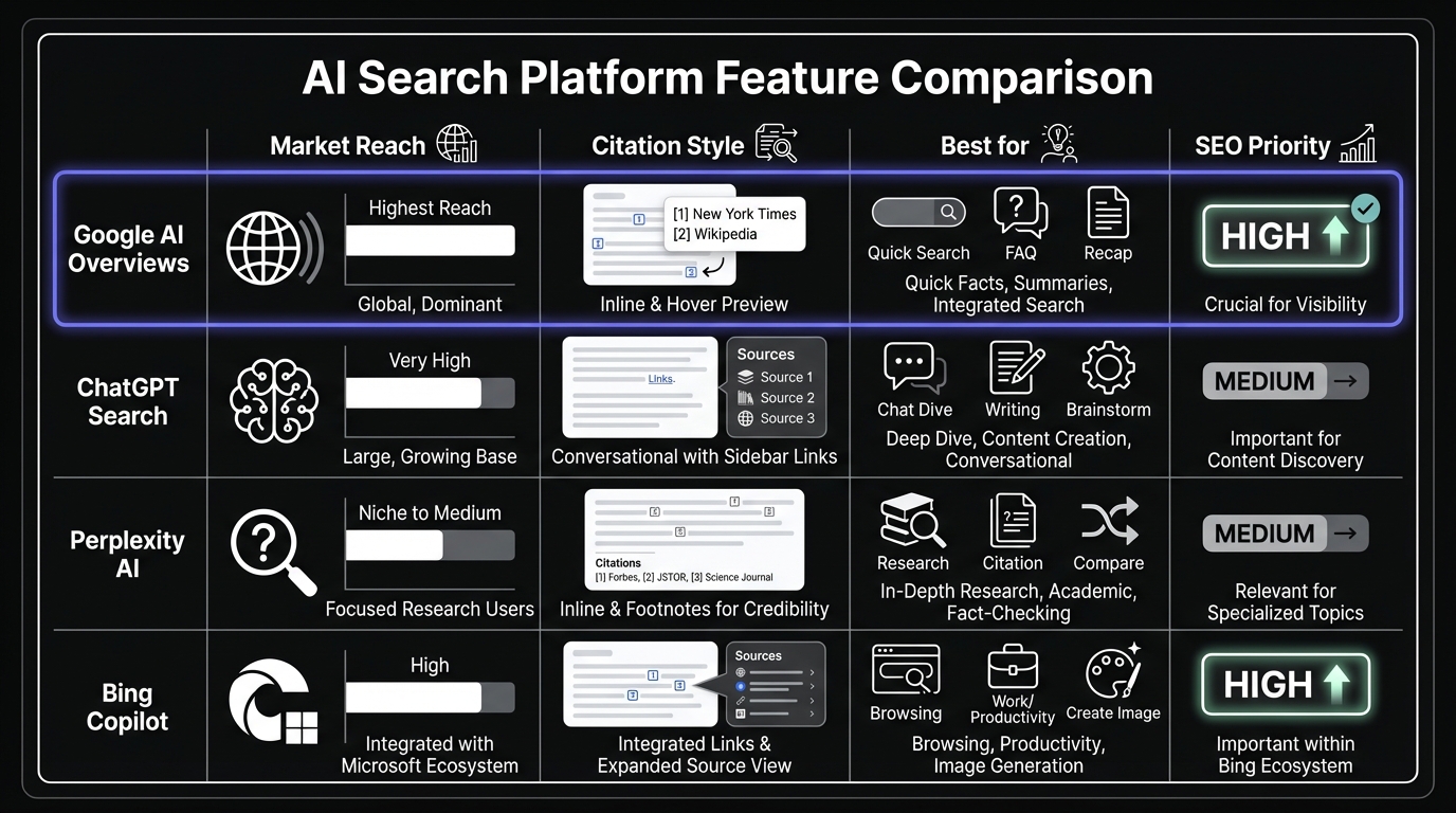 Google dominates search market share but the AI search landscape includes multiple players, each with different approaches and opportunities. Google AI Overviews (formerly SGE)