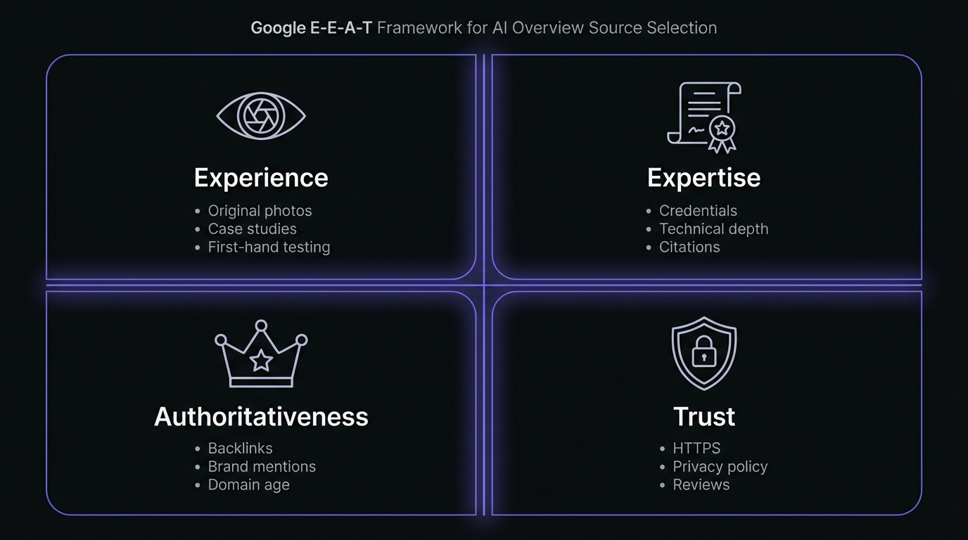"text": "E-E-A-T stands for Experience, Expertise, Authoritativeness, and Trust—Google's framework for evaluating content quality. These signals are critical for AI Overview source selection because Google prioritizes reliable, expert sources. Demonstrate E-E-A-T through author credentials, first-hand experience, quality backlinks, structured data, and transparent site information."