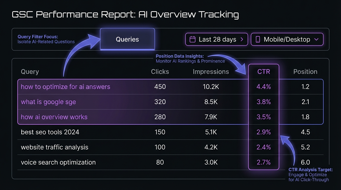 "text": "Google Search Console doesn't yet separate AI Overview metrics but you can track impact through CTR analysis for high-ranking queries, query pattern filtering (how-to, what-is, etc.), device-level segmentation, and manual spot checks. Look for CTR depression at positions 1-3 as a key indicator of AI Overview presence."