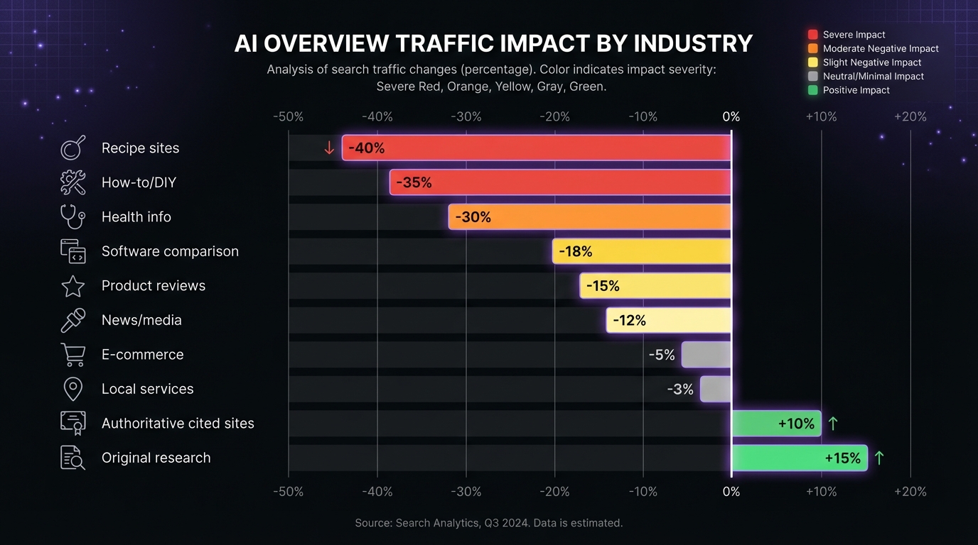 "text": "Traffic impact varies significantly by industry and query type. For informational queries, sites typically see 20-40% CTR reduction. However, sites frequently cited in AI Overviews may see traffic increases of 5-15% from brand awareness. E-commerce, local services, and branded queries see minimal impact."