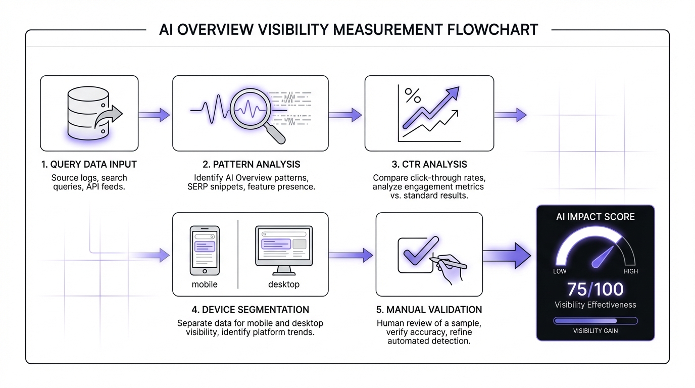 "description": "Step-by-step methodology for measuring Google AI Overview visibility using Google Search Console data, CTR analysis, and manual verification.",